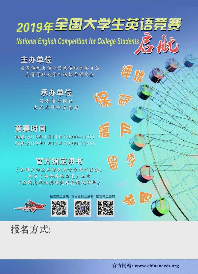 2019年全国大学生英语竞赛(NECCS)由教育部高等学校大学外语教学指导委员会和高等学校大学外语教学研究会联合主办,将于2019年4 月14日(初赛)、2019年5 月12日(决赛)进行。NECCS旨在贯彻落实教育部关于高等院校各类英语教学改革精神,激发广大大学生学习英语的兴趣。开展此项竞赛活动,有助于学生夯实和扩展英语基础知识和基本技能,全面提高大学生英语综合运用能力,推动大学英语教学质量上一个新台阶。