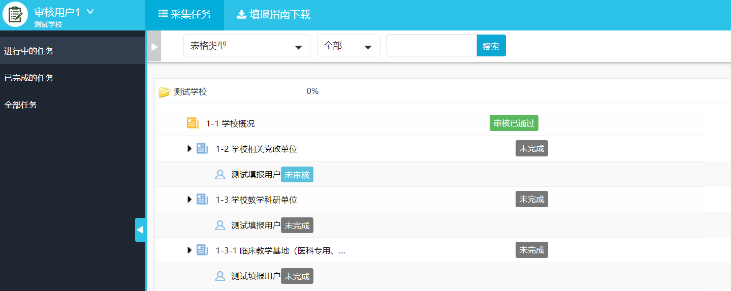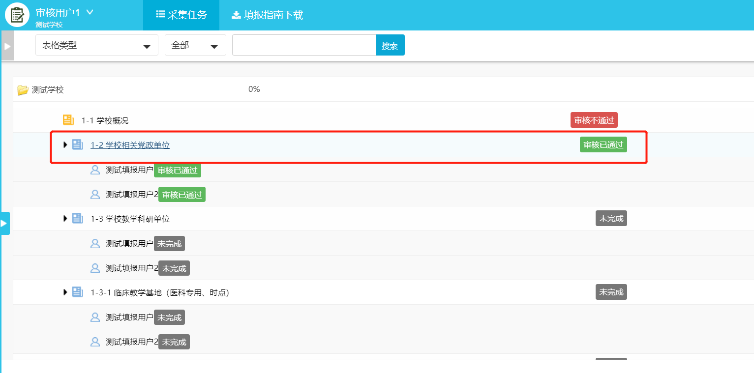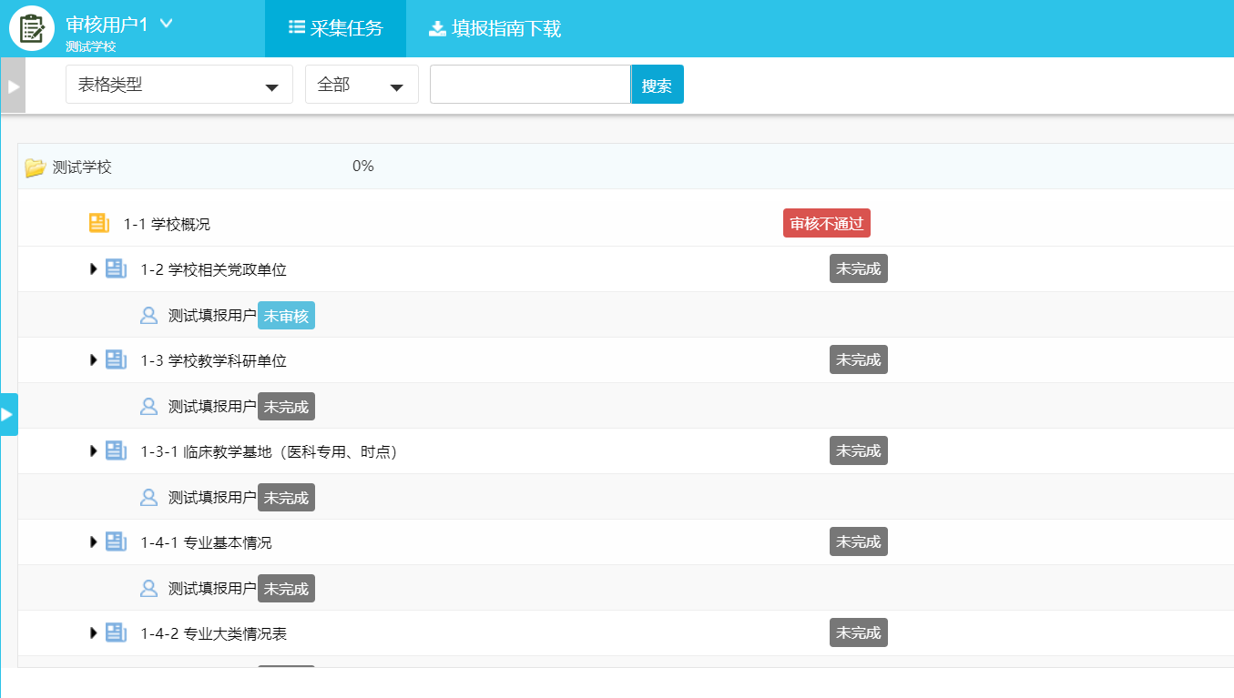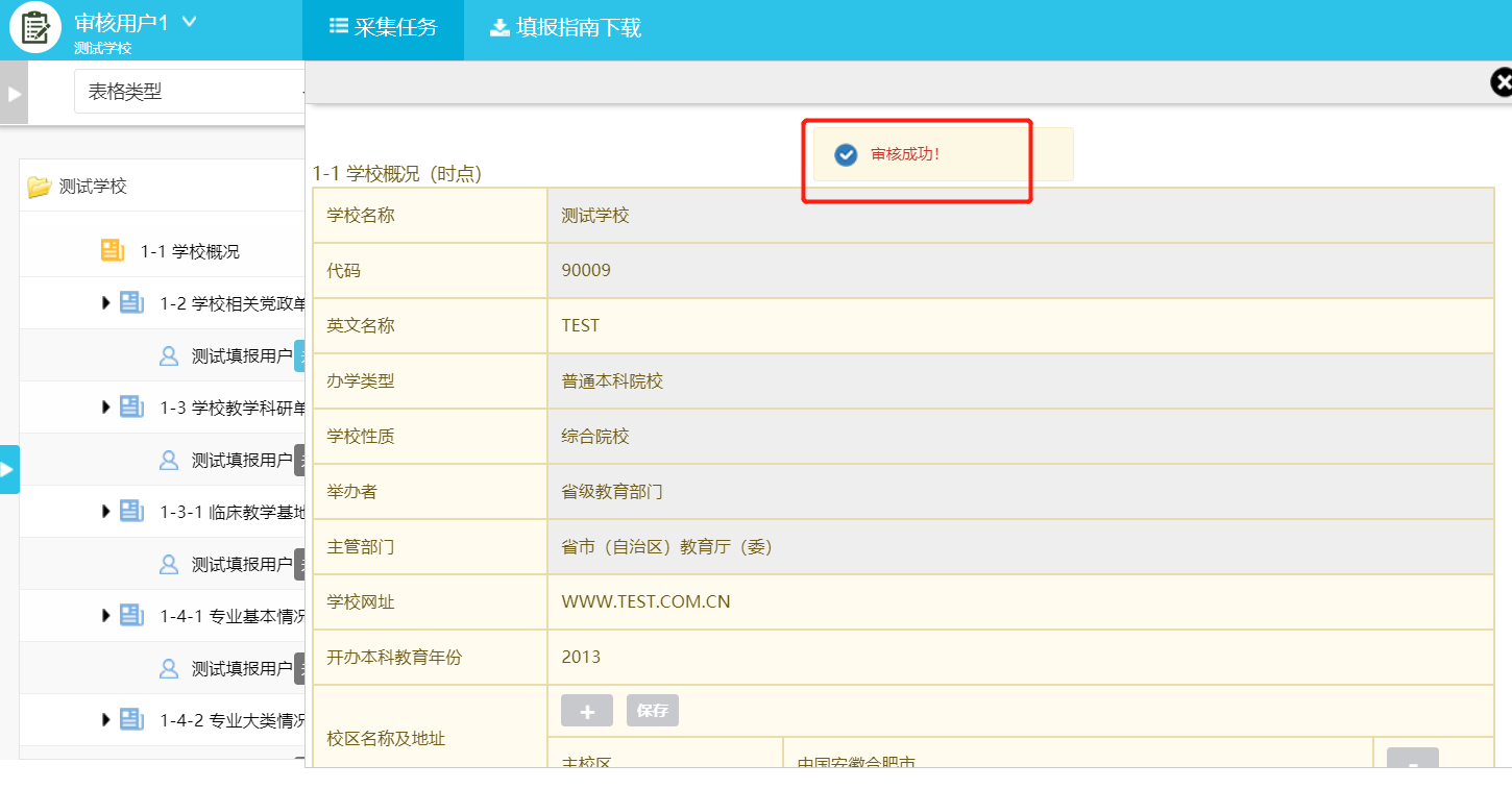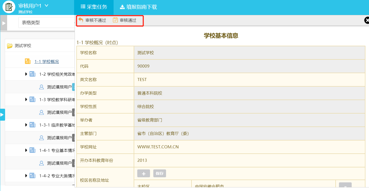 校级审核帐号只能对数据进行审核(未完成、未审核、审核不通过),不能对数据进行增加、修改、删除等操作。当校级管理员分配的审核任务达到100%即认为完成审核任务。