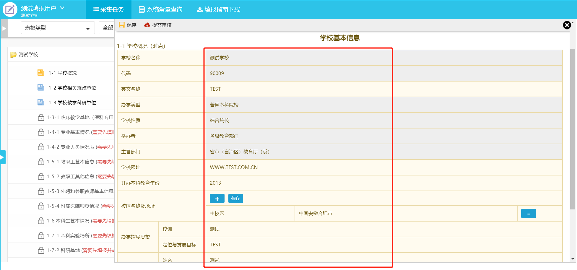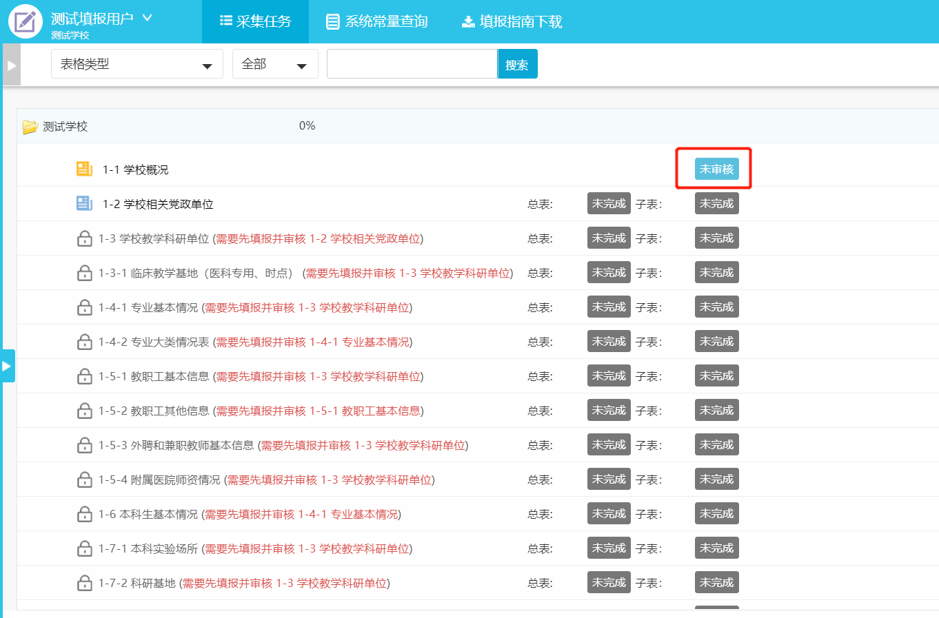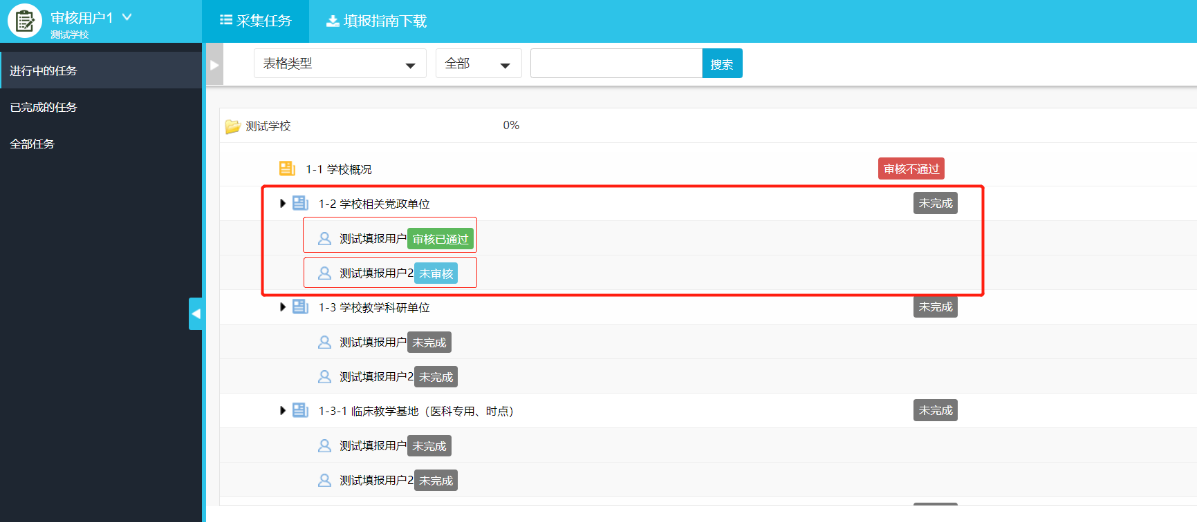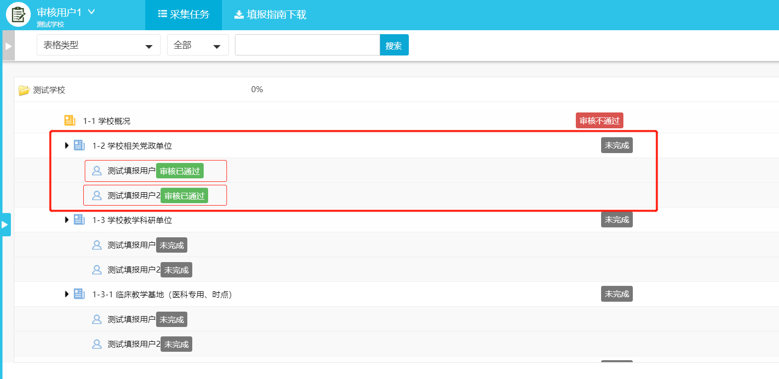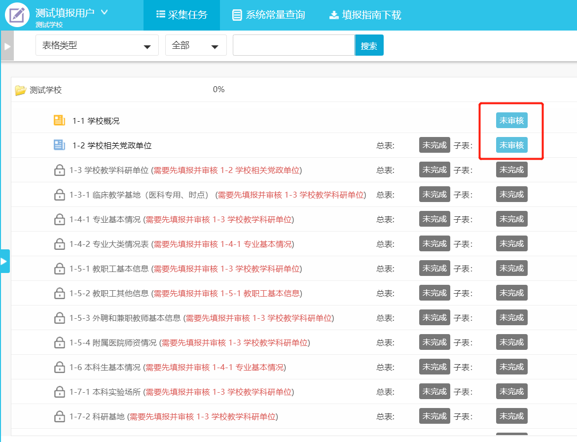校级审核帐号只能对数据进行审核(未完成、未审核、审核不通过),不能对数据进行增加、修改、删除等操作。当校级管理员分配的审核任务达到100%即认为完成审核任务。