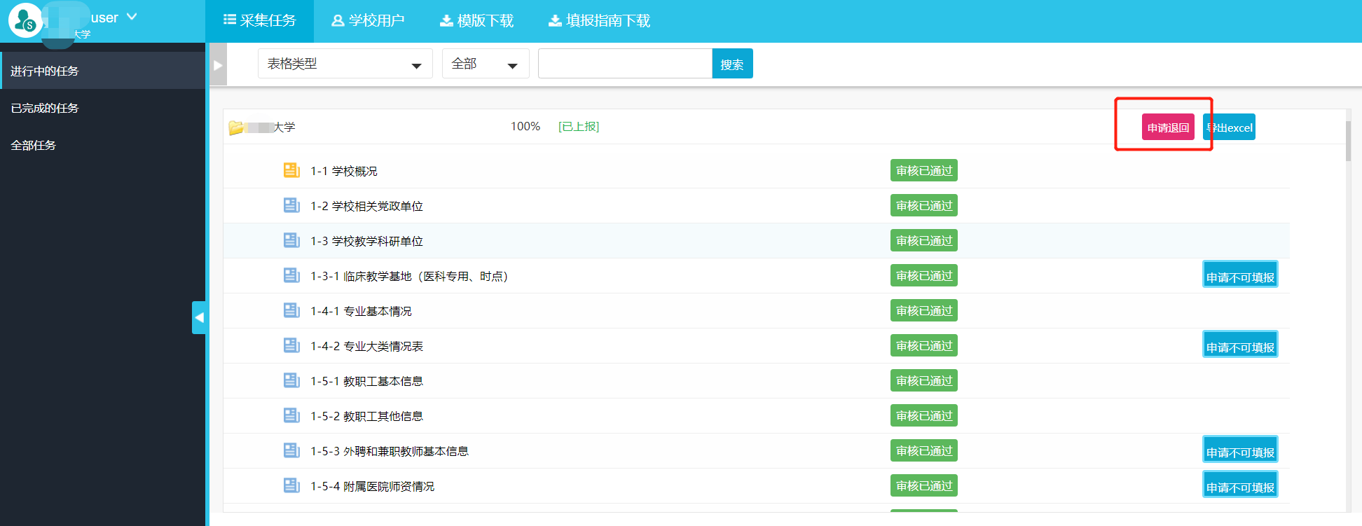 右侧可以看到所有表单的状态(未完成、未审核、审核通过、审核不通过),校级管理员帐号可以对校级审核用户审核通过数据进行最终确认,如果发现问题,可以进行退回操作(图4-14),但不能对数据进行修改、删除操作。