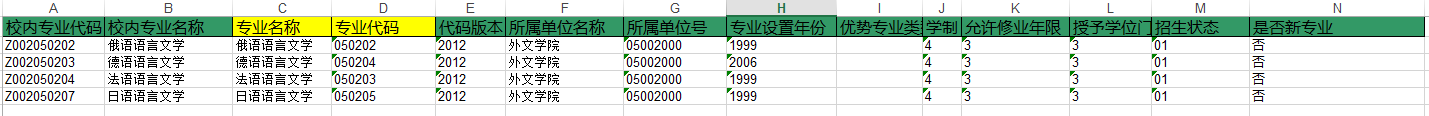 校内专业代码 | 校内专业名称 | 专业 名称 | 专业代码 | 所属单位名称 | 所属单位号 | 专业设置年份 | 学制 | 允许修业年限 | 授予学位 门类 | 招生状态 | 是否新专业 | 是否师范类专业 |