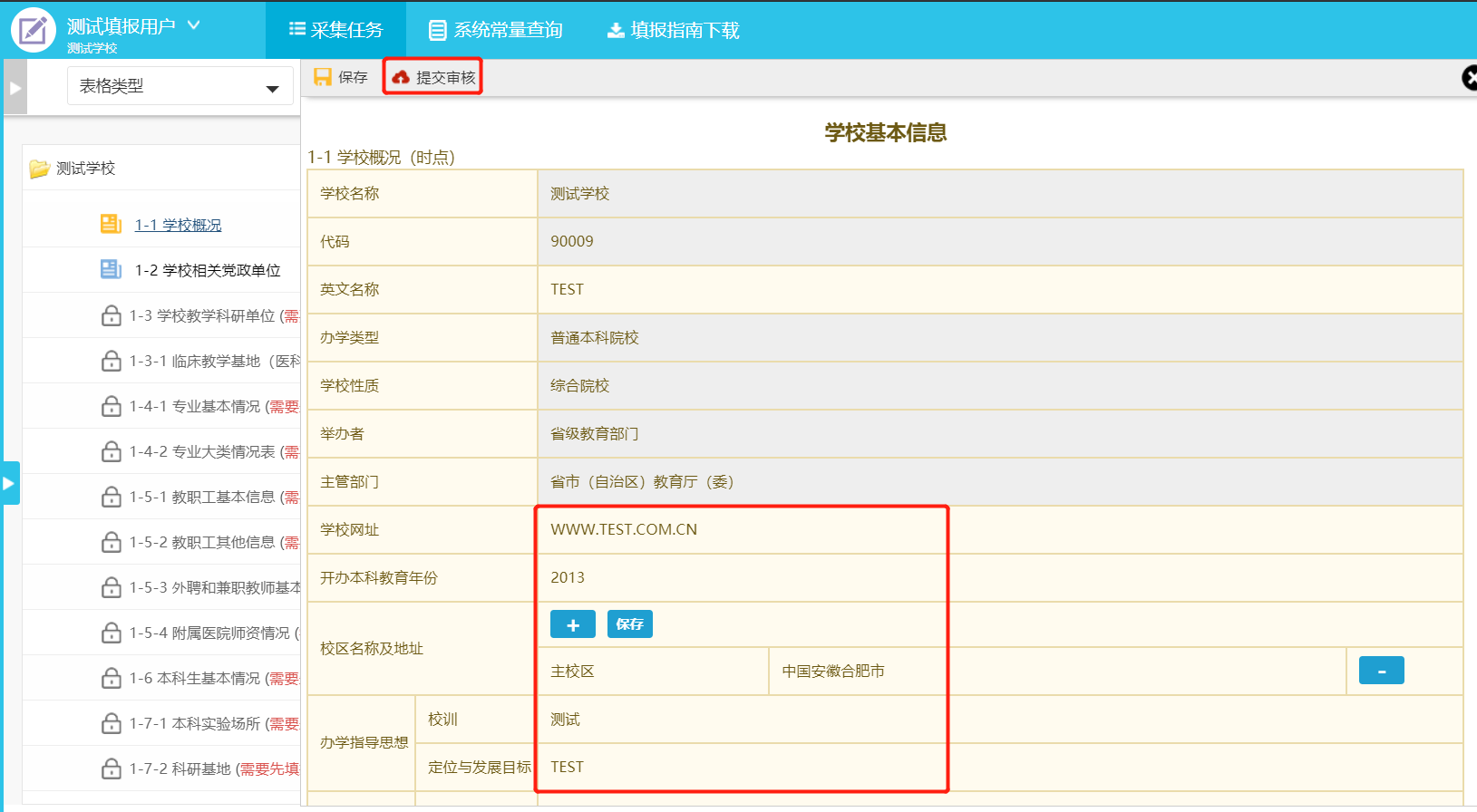 在表格相应位置的文本框中输入普通文本或者数字,全部填写完毕后,点击“保存”按钮完成保存才会出现“提交审核”按钮(如图3-6)。
