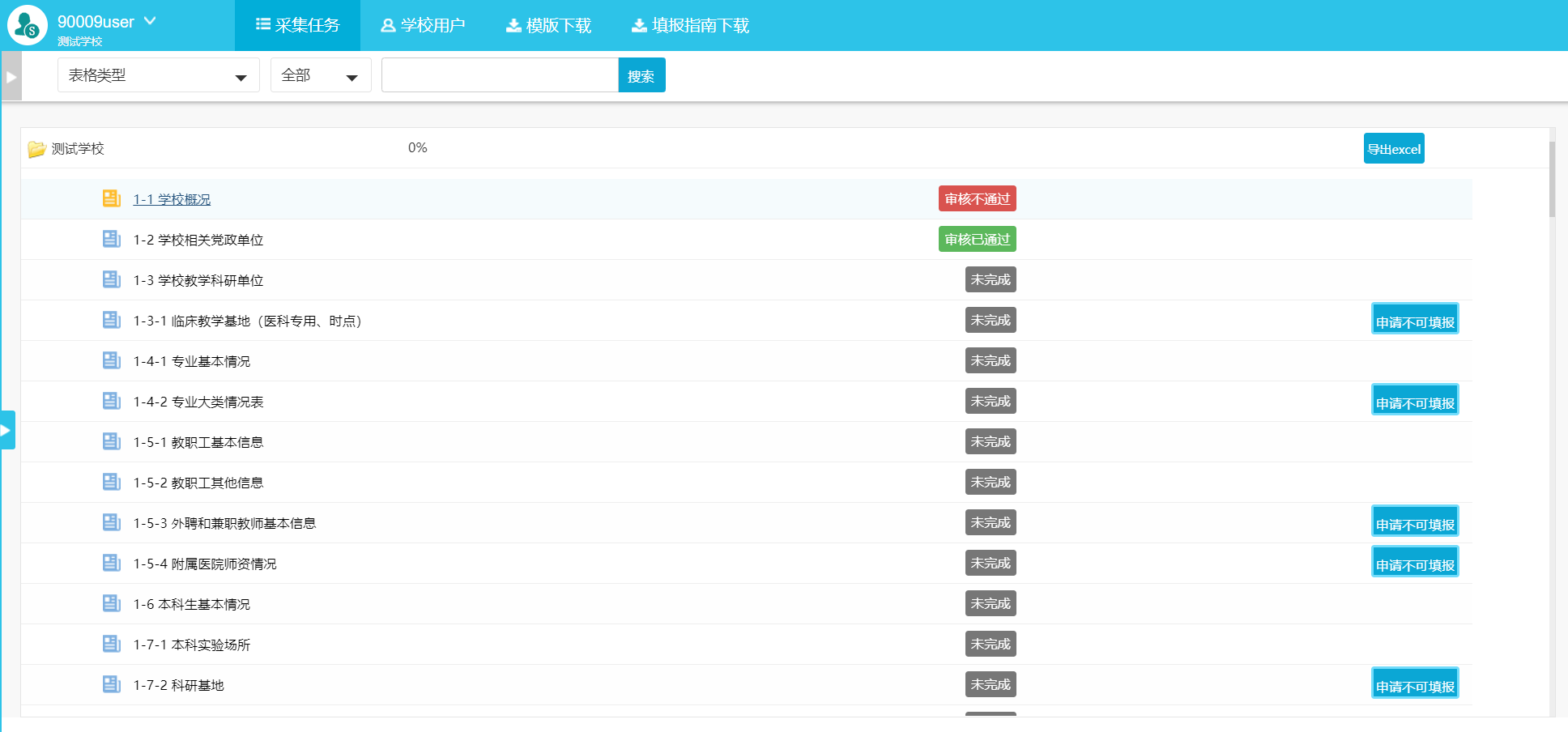 当前表单数据确认无误保存成功之后“提交审核”可提交至审核,提交审核后填报者无法再修改当前数据,只能对其表格进行查看、导出操作,如图3-19,并且该表格的状态变为“未审核”,如图3-20。等校级审核人员审核之后,该表格的状态变为“审核已通过”,如图3-21。如提交数据没有通过校级审核人员的审核,则该表退回至填报用户,且该表状态变为“审核不通过”,如图3-22。如提交数据并通过校级审核人员的审核之后仍需修改,则需要填报用户与校级管理员沟通,将该表退回至填报用户,该表的状态变为“审核不通过”。