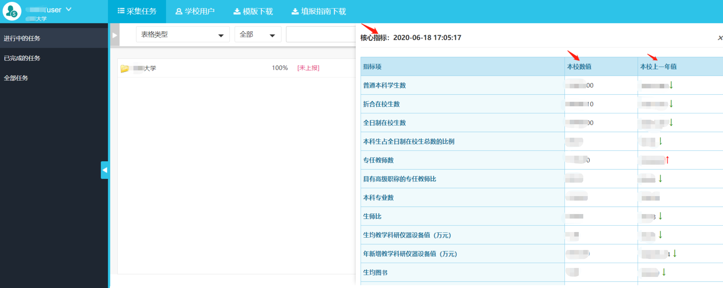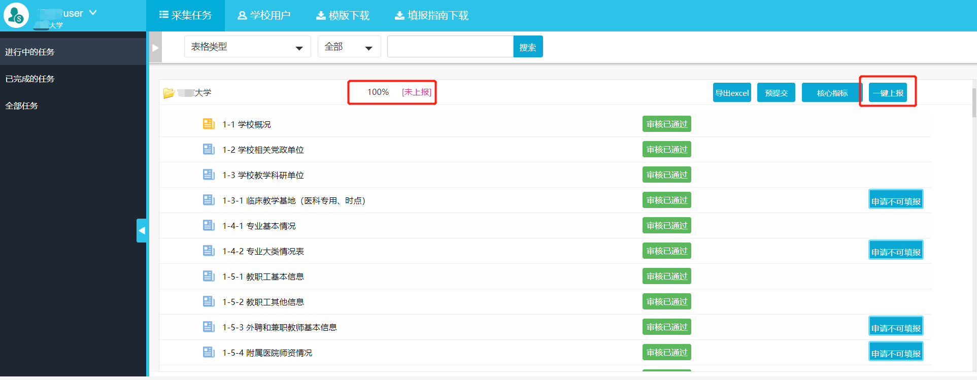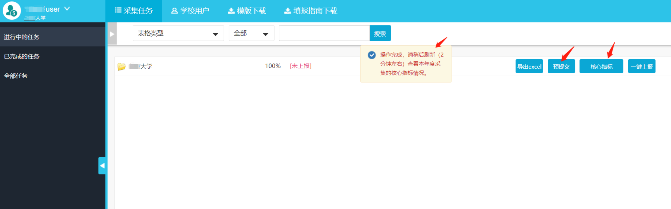任务上报进度达到100%后,学校可以点击“预提交”按钮,查看学校本次填报数据的“核心指标”数据情况: