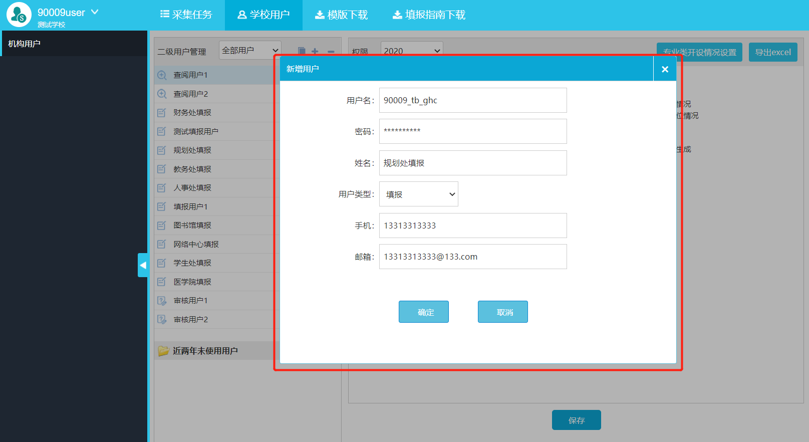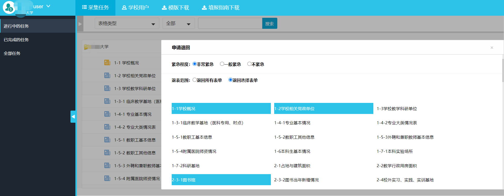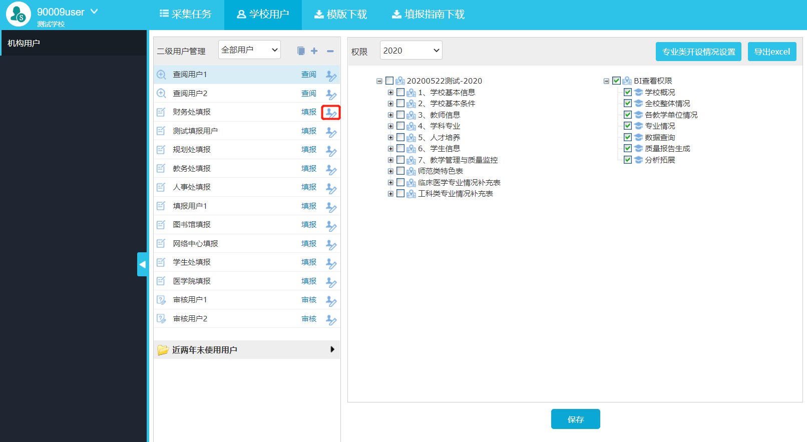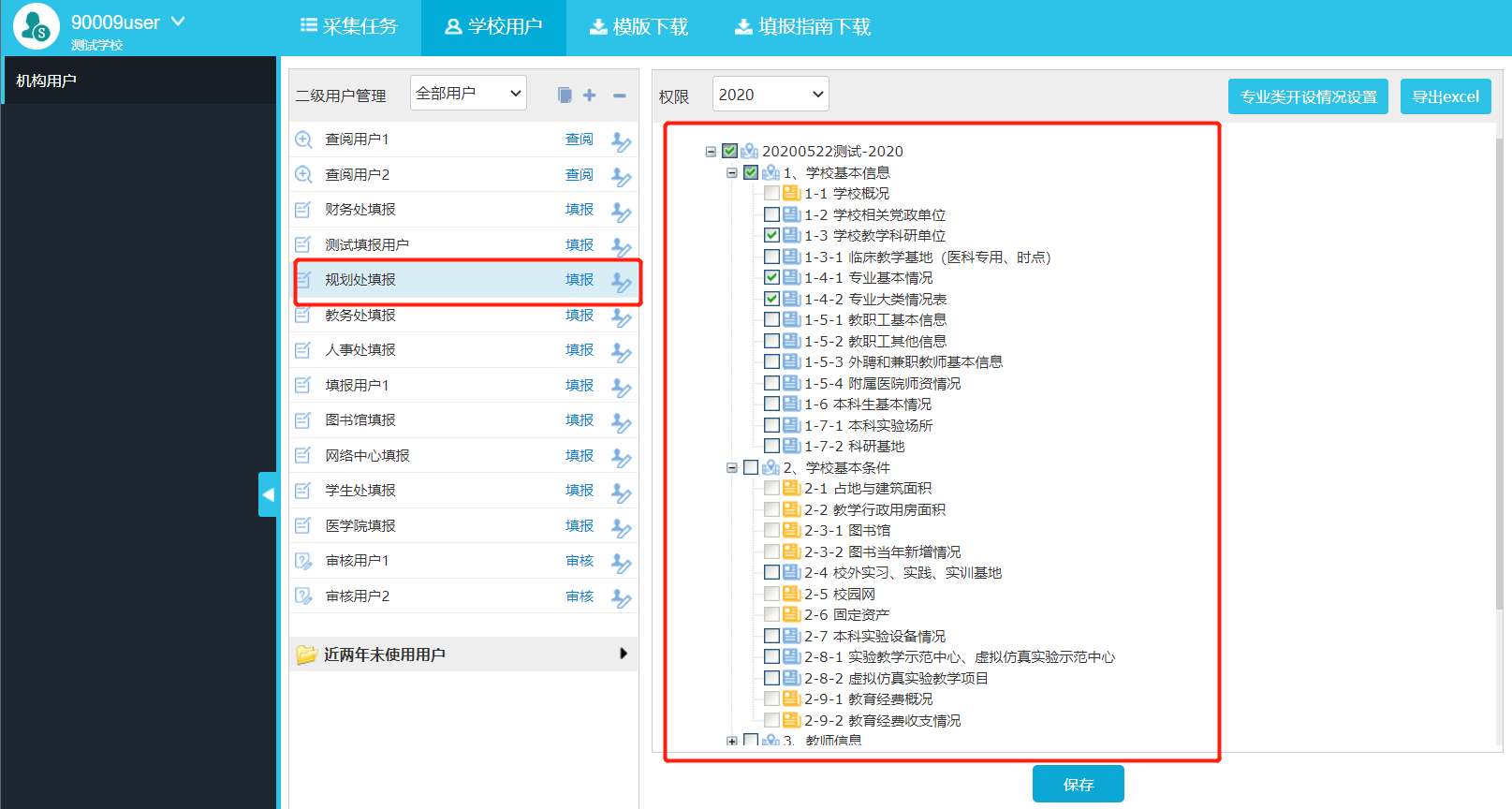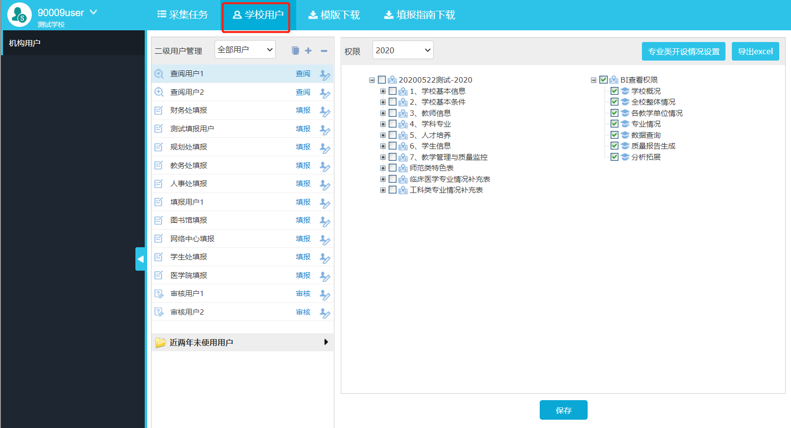 选择“学校用户”,可对用户进行表格授权,勾选对应的表格进行保存即可(图2-7)。