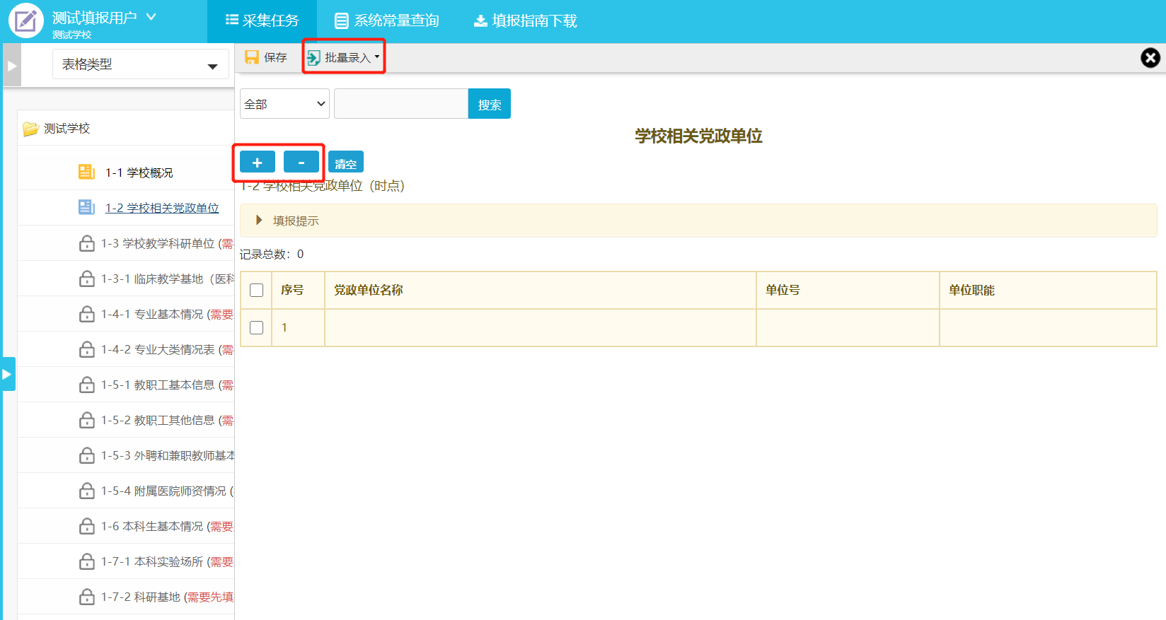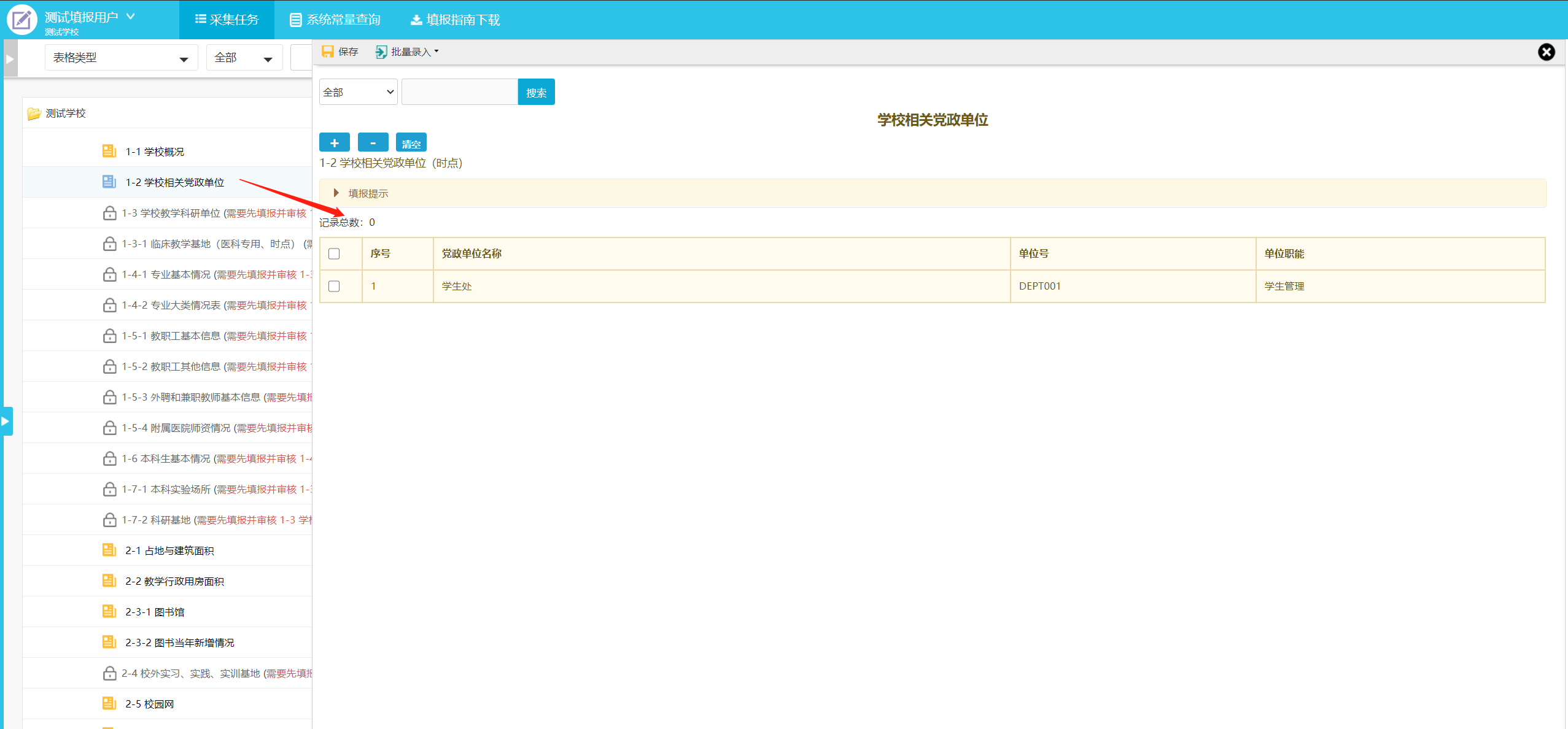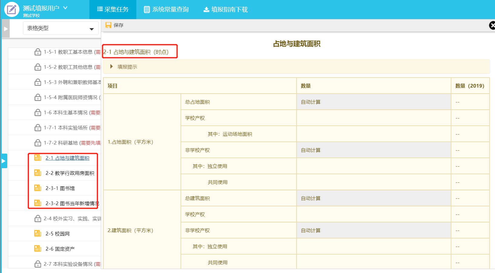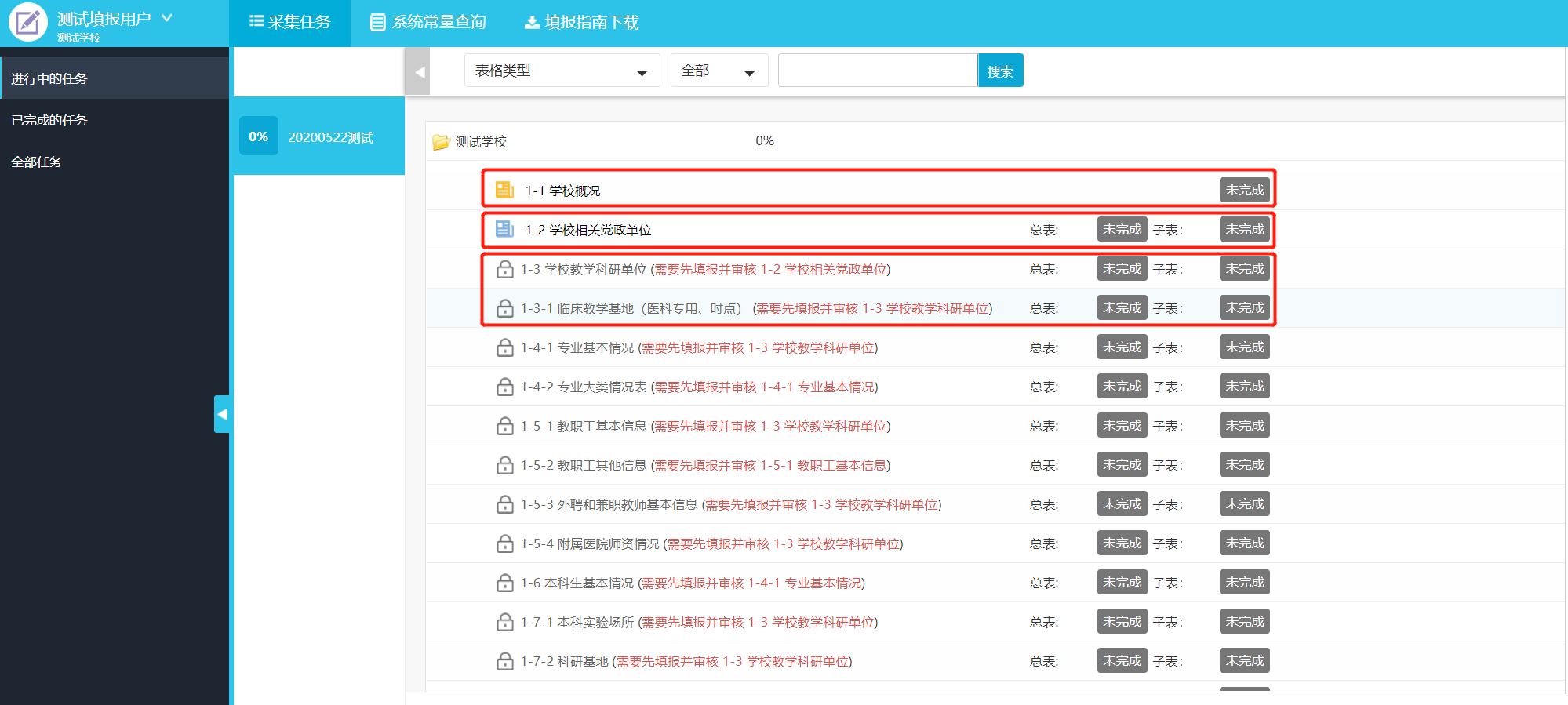 使用校级填报账号进入系统后,在任务区点击需要填报的任务,可展开目录显示待填报表单名(图3-1)。