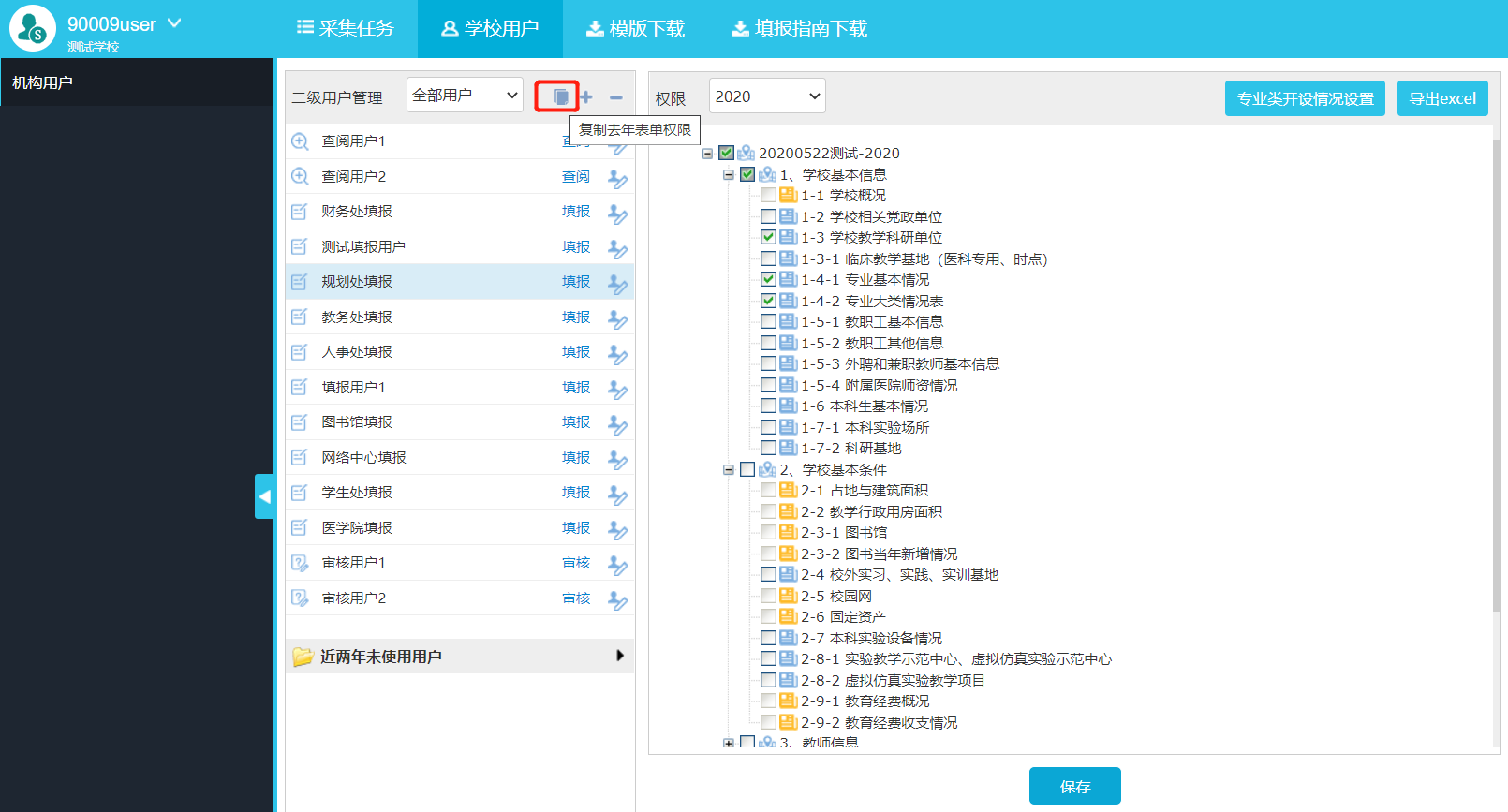 对于非第一次使用本系统进行数据采集的学校,学校管理员进入校级用户管理界面会看到上一年度建立的所有校级用户列表,如图2-8所示,点击复制上一年度的用户权限,可以使现有用户自动继承上一年度已有的授权体系,如图2-9所示,之后只需再根据当年采集数据表的新变化按照2.2.3的操作进行适当授权授权即可,无需重新一一勾选数据表格对校级用户进行授权。