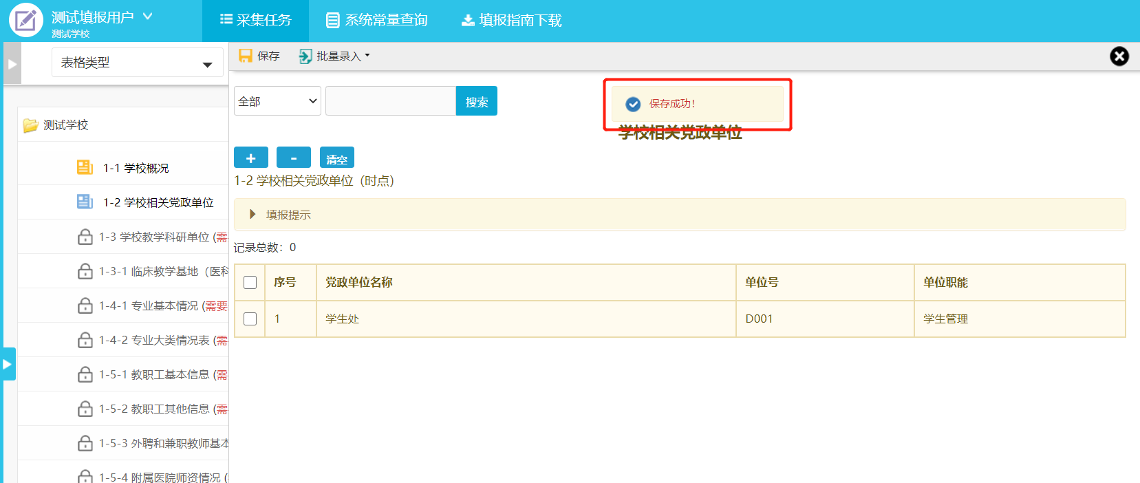 单击要填报的表单,系统在右侧显示表单信息,第一次以空白表单并进入录入状态,根据表单的业务进行数据录入之后,进行。如果要修改已填写表单则可以直接点击已填记录,系统将进入已填写表单(图3-2)。