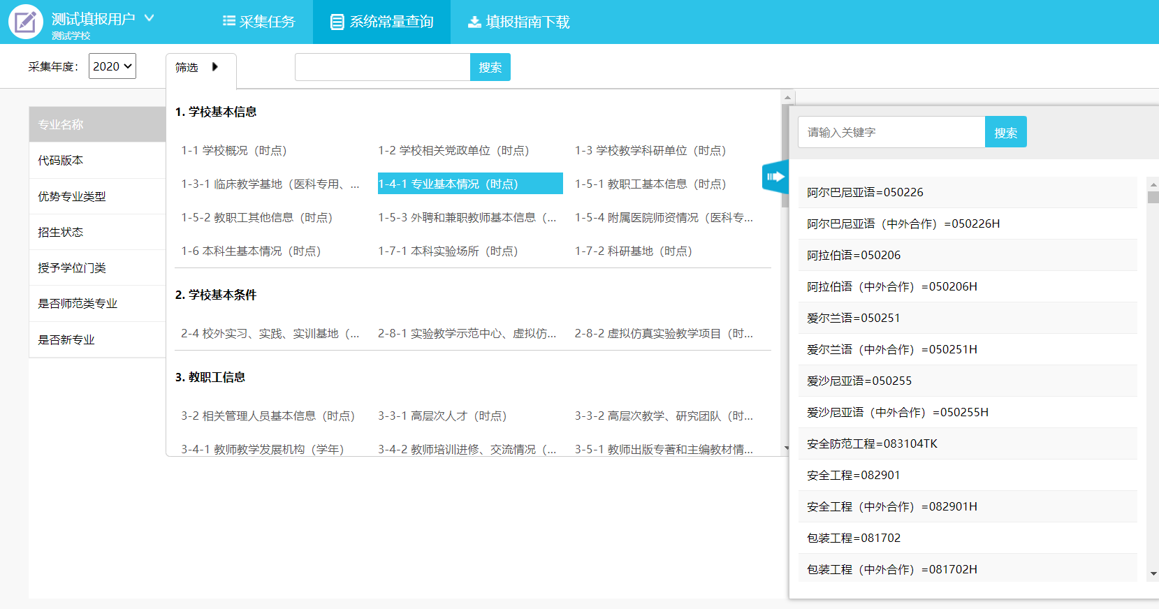 黄色底纹为国家信息标准数据,例如在“表1-4-1专业基本情况”中,“专业代码”为国家标准代码可根据国家《教育管理信息教育管理基础代码》2012版进行查询。