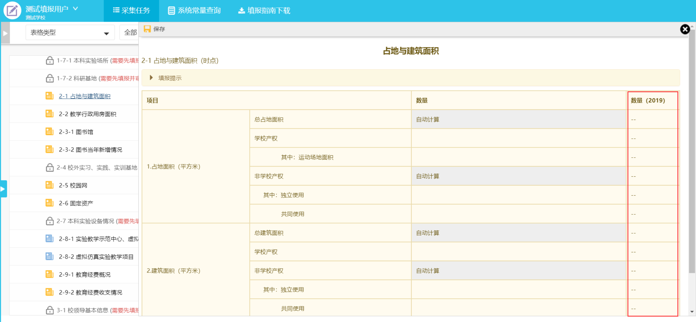 固定表单提供了上年数据对比功能(因为学校基本信息每年变动不大,表1-1是直接内置上年填报数据,填报人员可以按需进行修改,如图3-4-1所示),点击打开固定表单可以看到上一年度填报的数据情况,如图3-4-2所示: