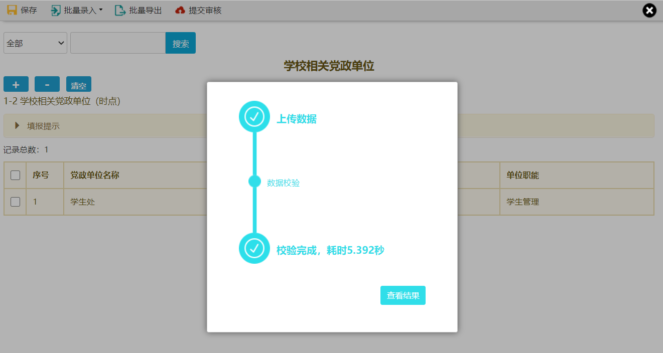 注:对于浮动表单,如果批量导入的数据大于2000条,会触发异步校验流程,此时系统将对上报数据进行排队校验用户无需在线等待校验结果,可继续进行其他表格的填报工作,待有空时再来查看校验结果,如图3-18所示。