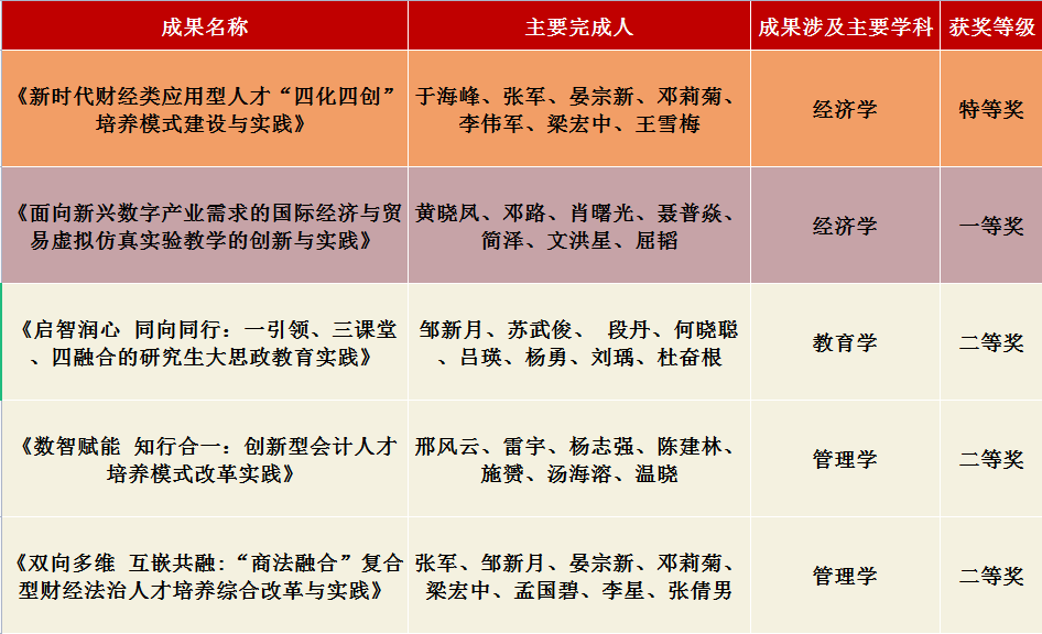 根据2022年5月公布的2021年广东省教育教学成果奖(四年评选一次),我校《新时代财经类应用型人才“四化四创”培养模式建设与实践》荣获广东省教育教学成果奖特等奖,为高等教育类15个特等奖成果之一,也是学校建校以来获得的首个省级教学成果奖特等奖。另取得广东省教育教学成果奖一等奖1项,二等奖3项(详见图1: 学校获得2021年广东省教育教学成果奖名单)。此次我校获奖总数量在全省高校排名第十,为近年来取得的最好成绩。另荣获广东省高等教育学会第二届高等教育研究优秀成果奖6项(详见表1:我校获得广东省高等教育学会第二届高等教育研究优秀成果奖清单)。
