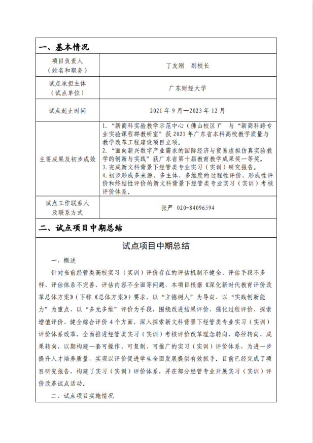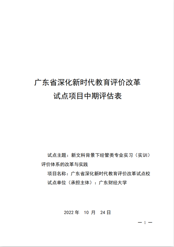 根据《深化新时代教育评价改革总体方案》要求,以“立德树人”为导向、以“实践创新能力”为重点、以“多元多维”评价为手段,围绕改进结果评价、强化过程评价、探索增值评价、健全综合评价4个方面,构建了新文科背景下经管类专业实习(实训)评价体系矩阵,形成了新文科背景下经管类专业实习(实训)研究报告,提交了广东省深化新时代教育评价改革试点项目中期评估表与佐证材料,评价等次良好。