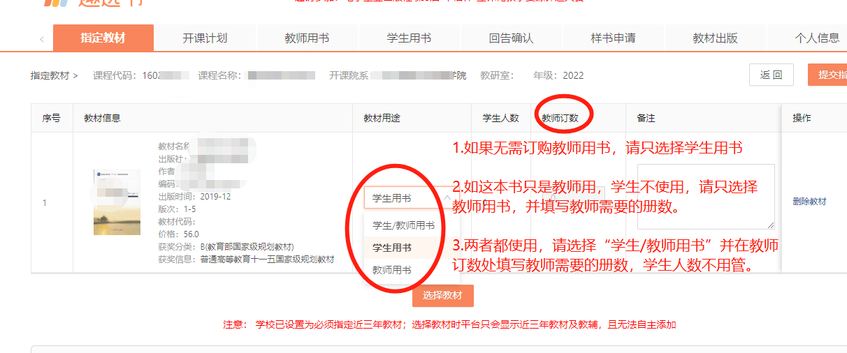 登录系统指定教材,教材负责人登录“趣选书”查看课程名称、课程代码是否准确,并指定课程教材。注意指定教材时勾选教师使用还是学生使用或者两者均使用,如无需教师用书,请选择学生用书。指定教材时,请仔细核对教材名称、出版社、作者、班次、ISBN编码等信息,以免误选。为避免老旧教材无法订购,请尽量选择近年出版的教材,以减少教材无法订购需更换教材情况(如果在电商网站没有销售的教材,教材负责人可提前联系出版社咨询能否订购)。如选用未审批过的境外教材、自编教材,请学院6月21日前提交选用审批表(附件6和附件7),以及教材样书至明胜m88官网审核(明德楼310办公室)。